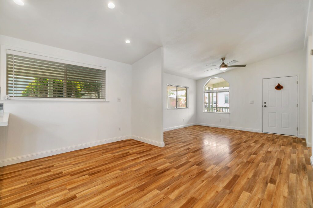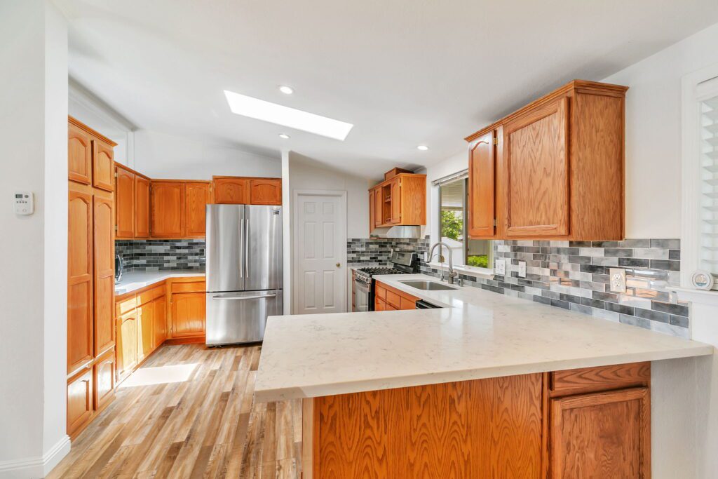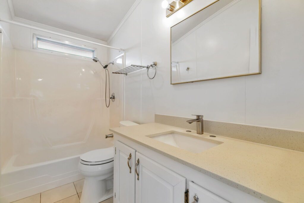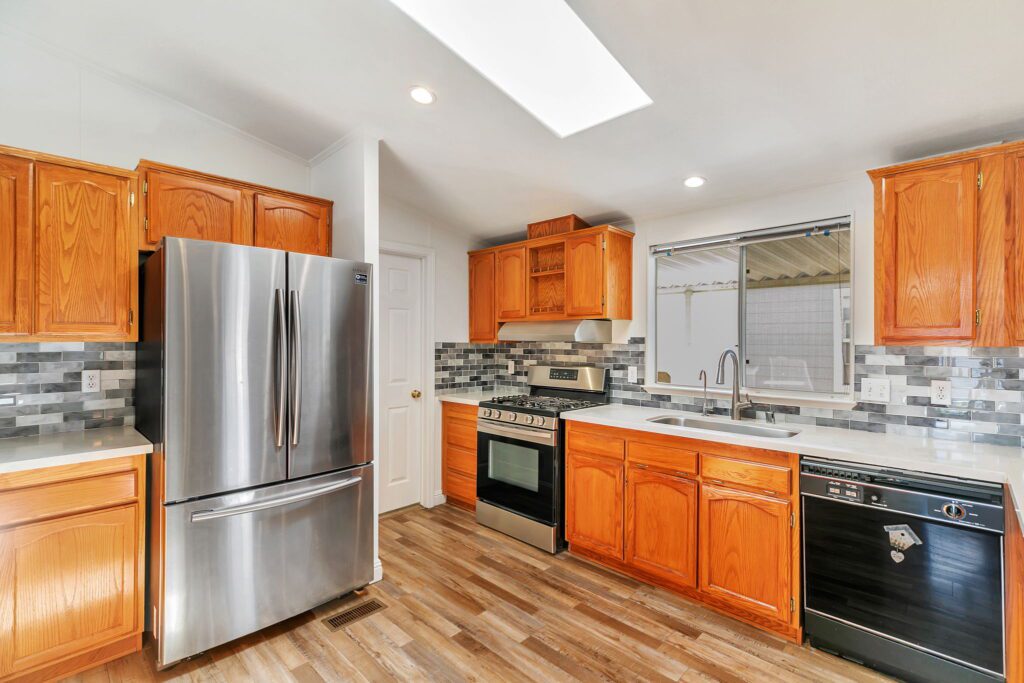 This meticulously maintained manufactured home offers 3 spacious bedrooms & 2 bathrooms in a desirable split floor plan that offers both privacy and functionality. Step into a bright and inviting living room & separate family room, perfect for entertaining or relaxing with loved ones. The renovated kitchen is a showstopper, featuring a large skylight, quartz countertops, stainless steel appliances, tile backsplash, and recessed lighting, all blending modern convenience with timeless elegance. Both bathrooms have been thoughtfully upgraded with stylish finishes, including quartz surrounds, dual sinks, a spacious shower, and a large sunken tub your personal retreat after a long day. This home has been lovingly cared for and thoughtfully updated: 30-year roof (installed in 2018), Brand new water heater (2025), Kitchen updates & bathroom update, laminate flooring throughout, composite decking on porch & rear steps. Enjoy peace of mind, low-maintenance lifestyle in a community that puts everything at your fingertips. With easy access to Hwy 101, 237 & 85, commuting to San Jose, Milpitas, Fremont, Mountain View, Santa Clara, or Palo Alto is a breeze. Don't miss this rare opportunity to own a stylish, move-in ready home in one of Sunnyvale's premier manufactured housing communities! Call (866) 494-8993 today for more information!