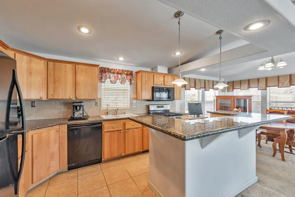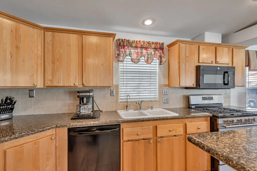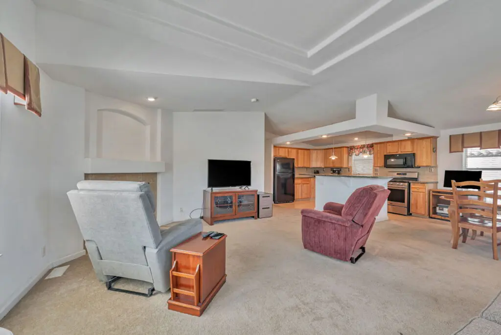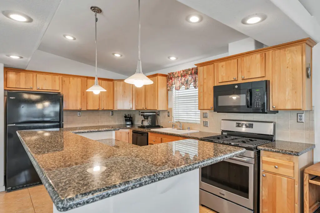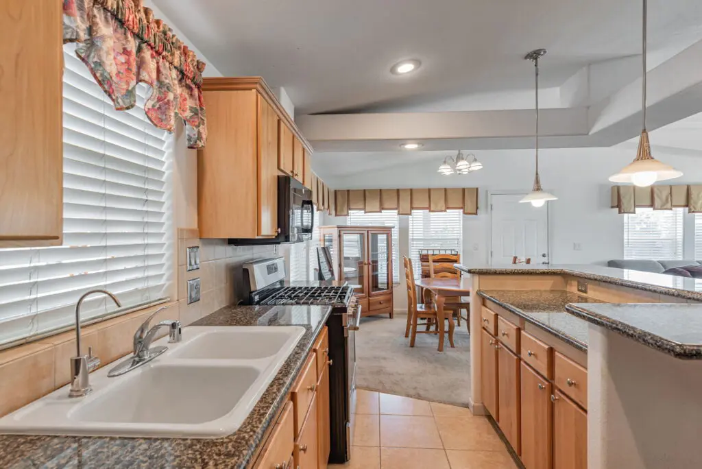 Discover this beautifully maintained 2007 Palm Harbor home located in the highly desirable Casa de Amigos community. This spacious 3-bedroom, 2-bath residence features an open floor plan filled with natural light, thanks to large windows throughout. The inviting living area includes a cozy gas fireplace and flows seamlessly into the expansive kitchen, which boasts a center island, snack bar, granite countertops, updated black/stainless steel appliances—perfect for both everyday living and entertaining. The primary suite offers a generously sized walk-in closet, a luxurious jetted corner tub, dual sinks, and a separate shower. Two additional bedrooms are spacious and versatile—ideal for family, guests, or a home office.