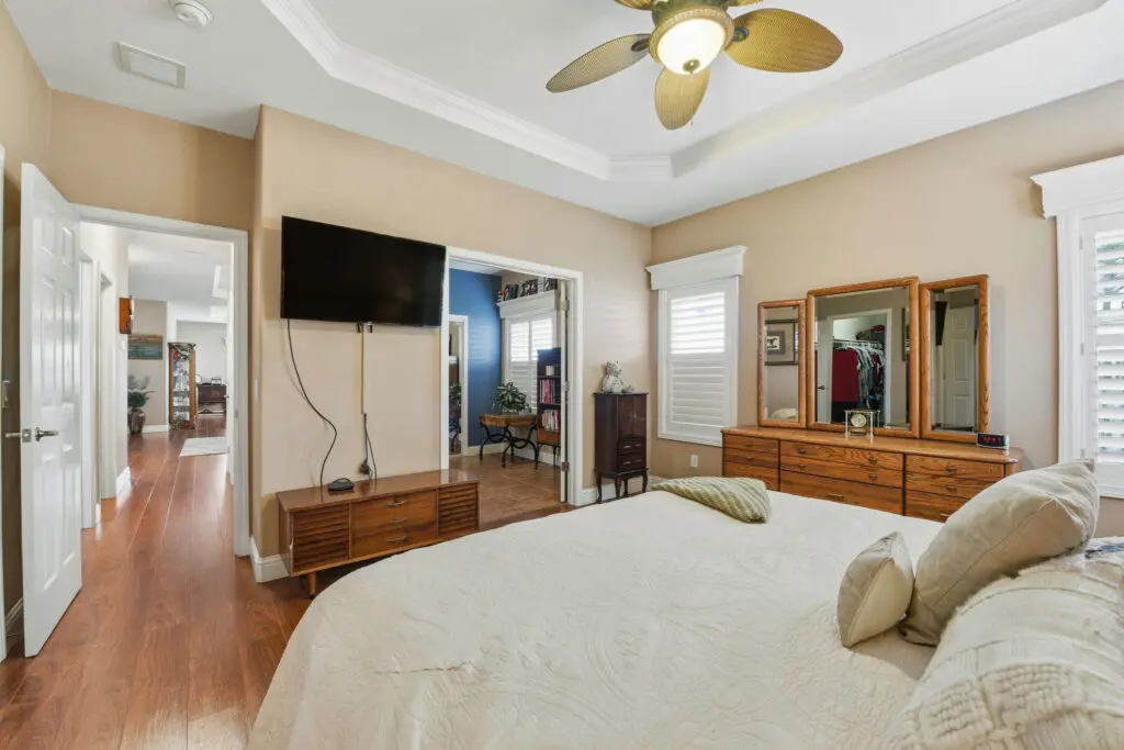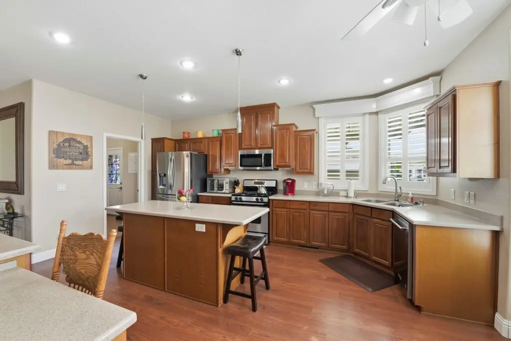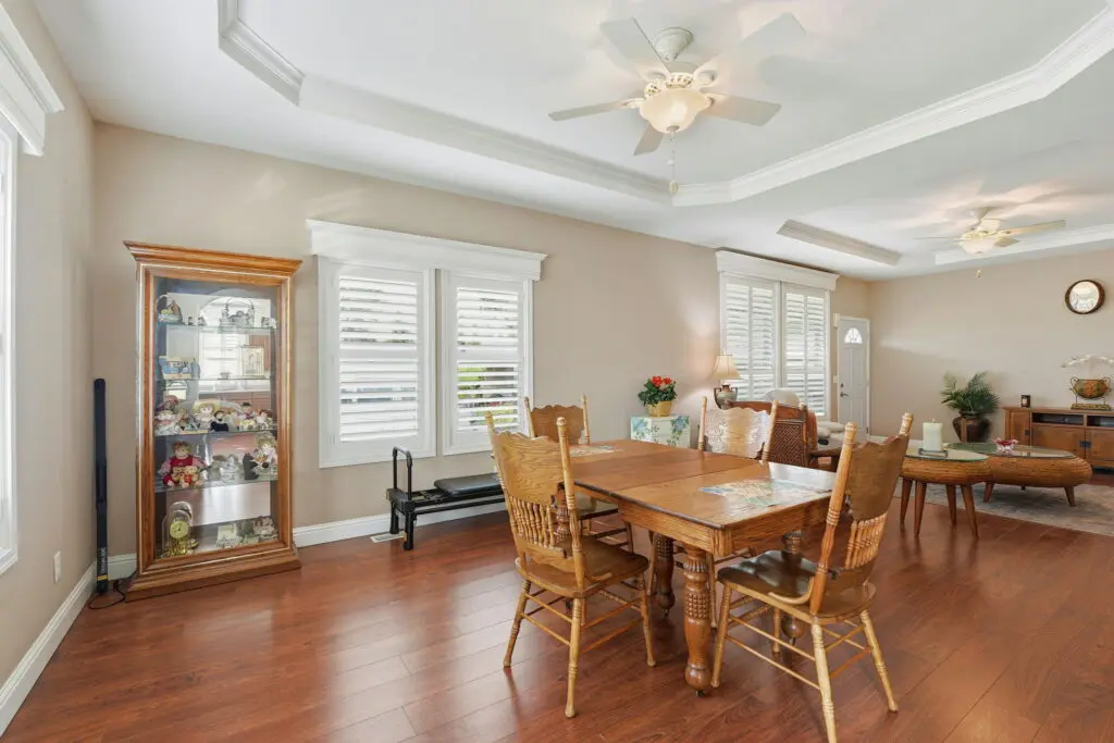 Experience warmth, elegance, and ease in this luxurious 3 bedroom, 2 bathroom home, perfectly located in the pristine 55+ Millpond community of San Jose. This elegant home welcomes you with soaring 9' tray ceilings, crown molding, custom tile and laminate floors, a cozy gas fireplace, and abundant natural light through dual-pane windows. The spacious kitchen features a center island, ample counter and cabinet space, and sleek stainless steel appliances—ideal for cooking, entertaining, or enjoying morning coffee. The serene primary suite boasts a walk-in closet, a spa-inspired bathroom with dual sinks and a shower-over-tub. The guest bedrooms are bright and comfortable, and the laundry room includes a built-in sink, washer, and dryer for added convenience. Step outside to enjoy a large side yard, a pavered patio, and a deck — perfect for entertaining or relaxing outdoors. The home also features a wheelchair lift, making it accessible and functional for all. Beautifully maintained and thoughtfully designed, this elegant home combines style, comfort, and functionality in one of the area’s most sought-after 55+ communities. Call (866) 494-8993 today for more information!