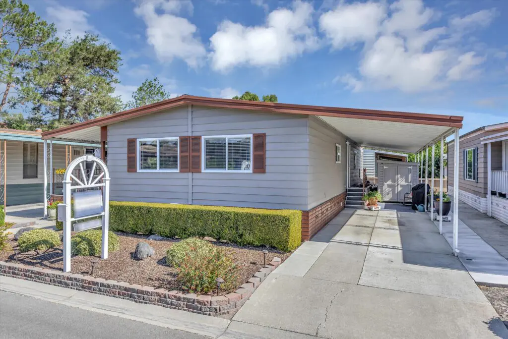This beautiful home is located in Millpond, one of San Jose's most beautiful active senior communities. The 2 bedroom, 2 bathroom home boasts a spacious living space with convenient built-ins that add to the charm. Updated features include total remodel on master bathroom, 2 new sheds, new dual paned windows, copper plumbing, replaced all awning posts, new ceiling fans (2016); total kitchen remodel including appliances (2017); new landscaping, new screen door (2018); updated built-in hutch, new bar counters, exterior paint, new counters/flooring in laundry room (2019); new roof, new guest bedroom ceiling (2020); complete interior paint including ceilings, added hardscape to landscaping including brick word and concrete; termite tented (2021); updated guest bathroom, new water heater (2023). Both bedrooms are spacious with large closets and ceiling fans. The laundry room has a utility sink, washer/dryer, and more space for additional storage. With so much to offer, this home is perfect for you! What are you waiting for? Call (866) 494-8993 today for more information!
