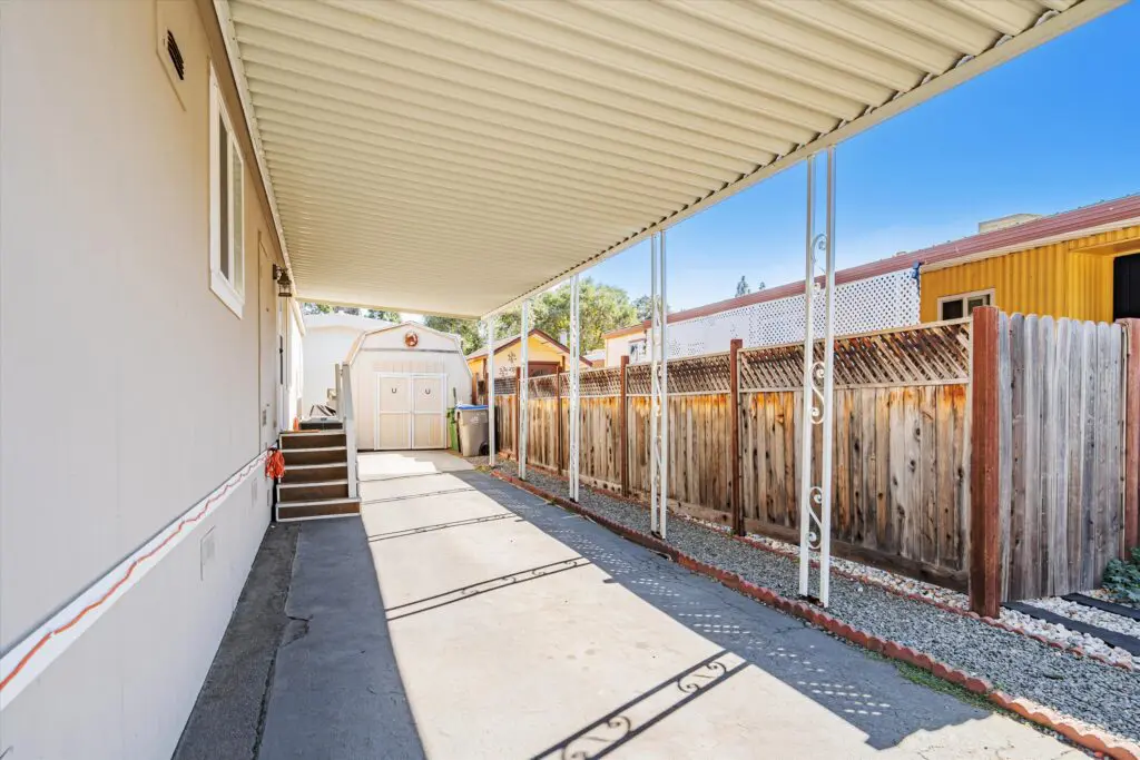 Move-In Ready, and low space rent! This stunning mobile home in the highly desirable Monterey Oaks community is a must-see. Enjoy spacious living with over 1500 Sq.Ft. of thoughtfully designed space. Upon entering, you'll be greeted by a large living room featuring a cozy fireplace surrounded by elegant tile and a custom mantle. The entire home boasts beautiful laminated floors for easy maintenance. The spacious eat-in kitchen features soaring ceilings, a large island with oak cabinets, and solid surface countertops. A convenient laundry room/pantry area offers plenty of storage and has a washer and dryer. The primary bedroom is a true retreat, complete with a walk-in closet and en-suite bathroom featuring a large soaking tub, dual vanities, a separate toilet, and a stall shower. The hall bath includes a shower over tub and a skylight for added natural light. This community offers an array of amenities, including a pool, spa, gym, tennis court, clubhouse, basketball hoop, children's playground, barbecue area, laundry room, and 24/7 security patrol. Conveniently located near restaurants, shopping, and major highways (85 & 101), this home offers the perfect blend of comfort, convenience, and community. Don't miss this opportunity to make this beautiful mobile home your new home!