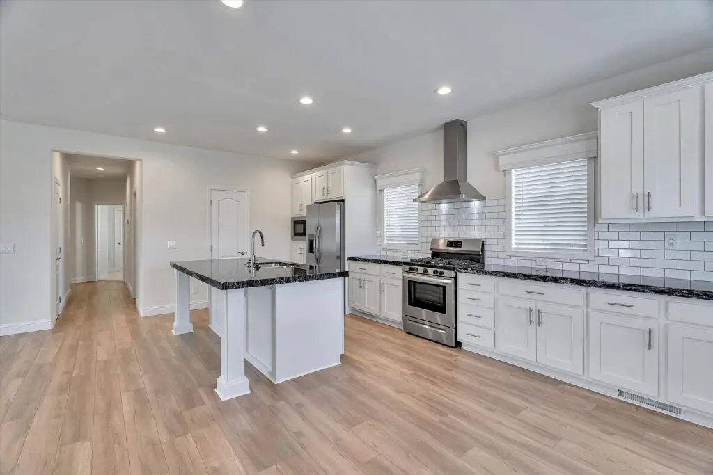 This stunning brand new home showcases approx. 1,680 sq. ft. of living space, 3 spacious bedrooms, 2 bathrooms, recessed ceiling with exposed beams, LED fireplace, and granite countertops. The open concept kitchen, which overlooks the living area for easy social entertainment, features a stunning island with columns that support the overhang, Frigidaire stainless steel appliances, ample white cabinetry, and white subway tile backsplash. The master suite is situated privately away from the rest of the bedrooms toward the back of the home and enjoys a soaking tub, dual sinks, separate shower, and generous walk-in closet. The two additional bedrooms and full bath are roomy, bright, and has tons of space for storage. Discover the other great features this beautiful home has to offer! Call (866) 494-8993 today for more information!