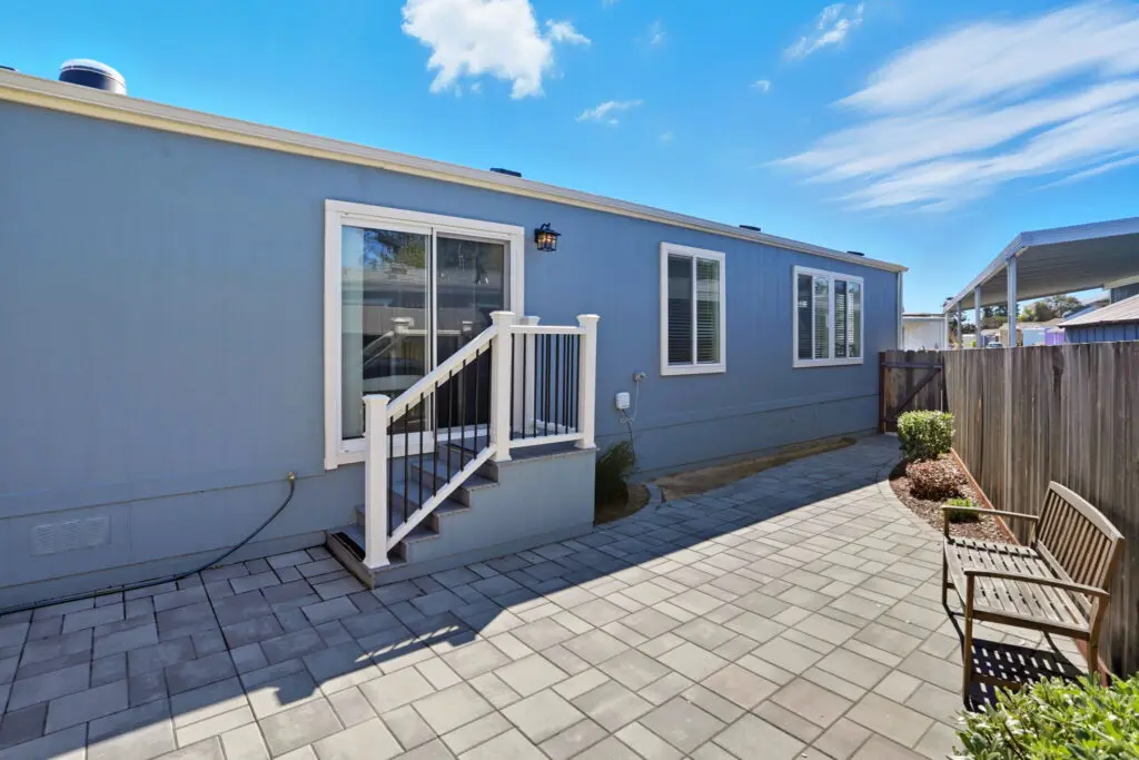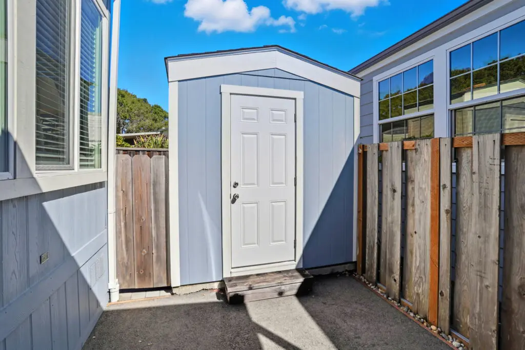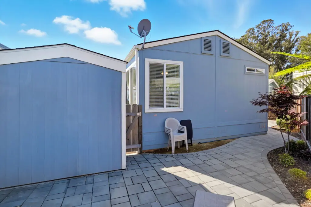 Discover this charming 2020 manufactured home located in a desirable 55+ Shoreline Estates mobile home park near the stunning beaches of Santa Cruz. This light, bright, and airy home features an open floor plan with 2 bedrooms, 2 bathrooms, and a versatile den that can serve as a home office, hobby room, or additional bedroom. The home shows like new and offers laminate flooring throughout, white cabinetry, and stainless steel appliances that add a modern touch. Beautiful pavers surround the home, creating inviting outdoor spaces to relax or entertain. The guest bedroom includes a sliding glass door that opens to the side yard, while the primary suite offers two closets and a private bathroom with a large step-in shower. A private yard provides the perfect place to soak up the sun, and all appliances, including the washer, dryer, and a storage shed, are included. The owner is also willing to include all furniture, making this home truly move-in ready.