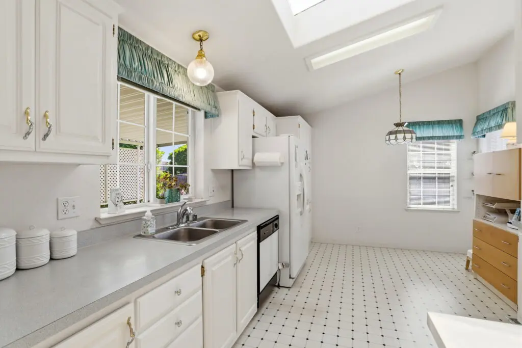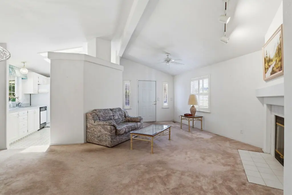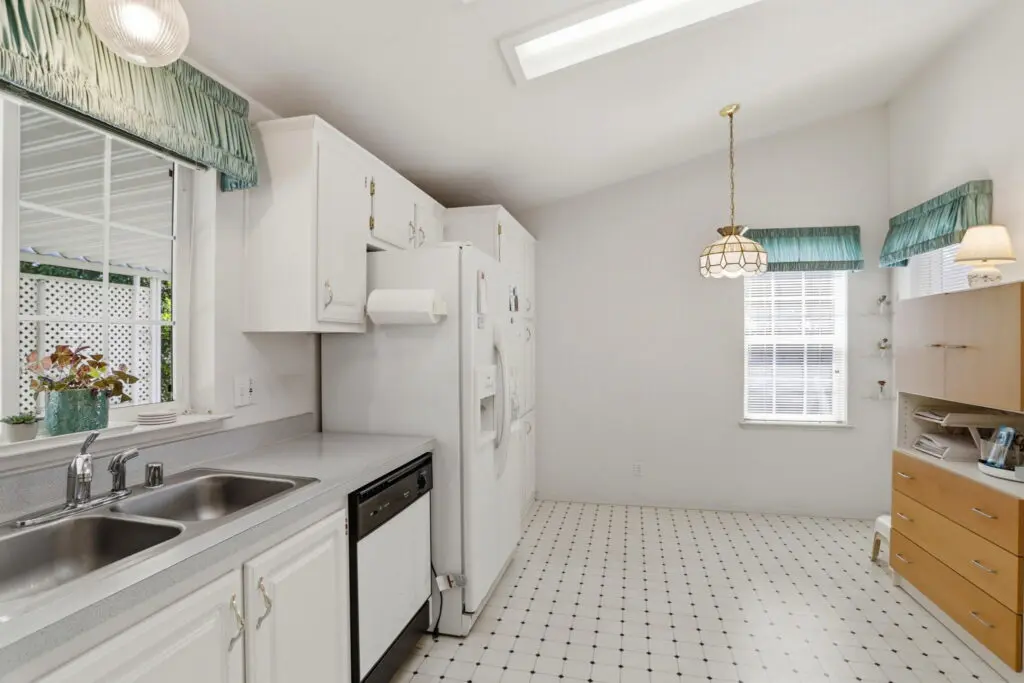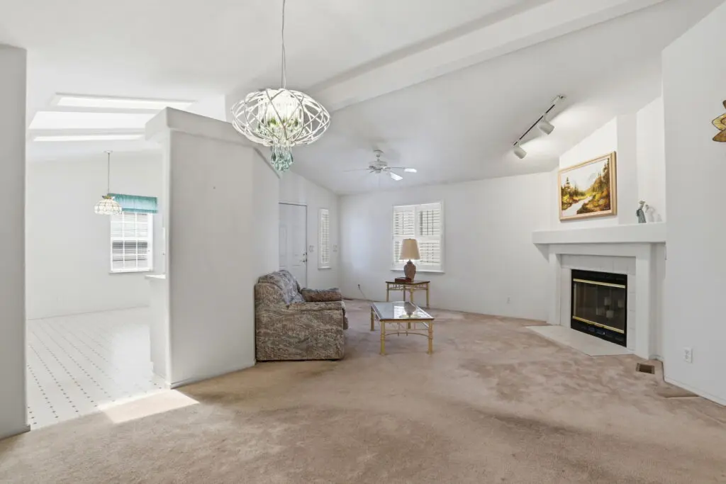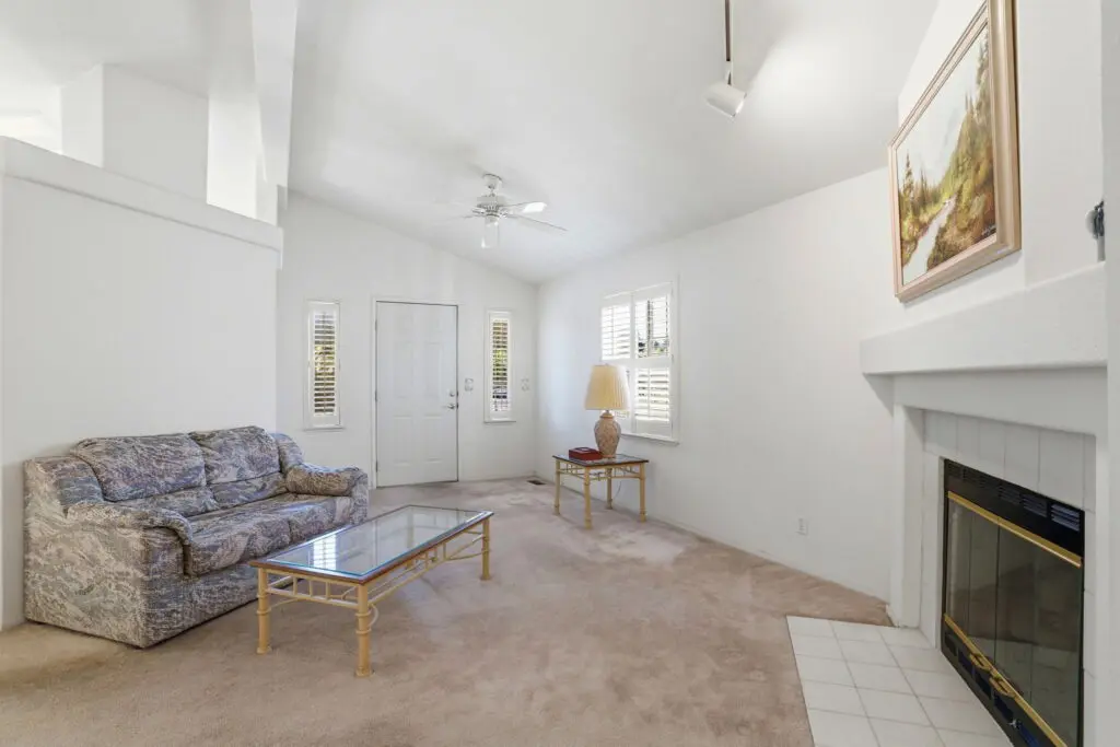 Welcome to this inviting home located in a desirable 55+ senior community, offering comfort, convenience, and thoughtful features throughout. Plush carpeting flows from room to room, creating a warm and cozy atmosphere. The living room is the heart of the home, featuring a charming fireplace—perfect for relaxing evenings or gathering with friends and family. The bright kitchen is complemented by a cheerful breakfast nook, complete with a skylight that fills the space with natural light. Matching white appliances add a clean, cohesive look. The guest bedroom is comfortably sized and includes ample closet space for storage. The spacious primary suite offers a peaceful retreat with a ceiling fan, a generous walk-in closet, and a private bathroom featuring dual sinks and a luxurious corner garden tub. Additional highlights include a large laundry room with plenty of storage space to keep everything organized, as well as a wheelchair lift near the side entry for added accessibility and ease of use. This home combines comfort, practicality, and charm—perfect for relaxed living in a welcoming community. Call (866) 494-8993 today for more information!