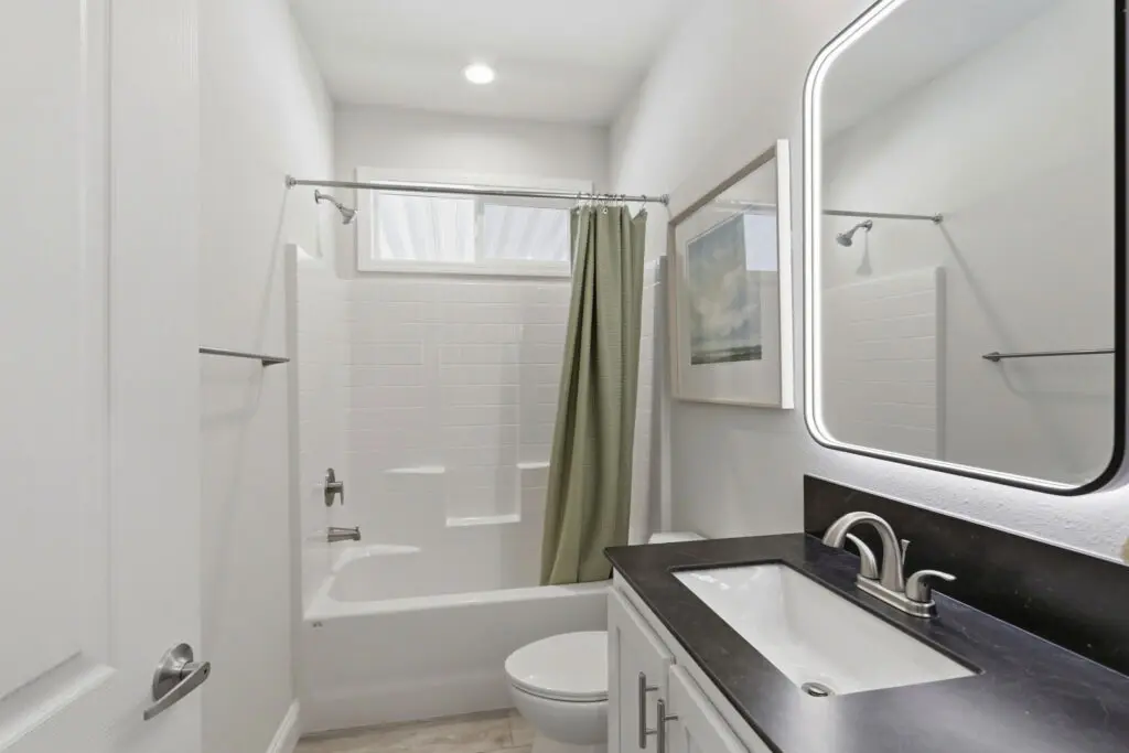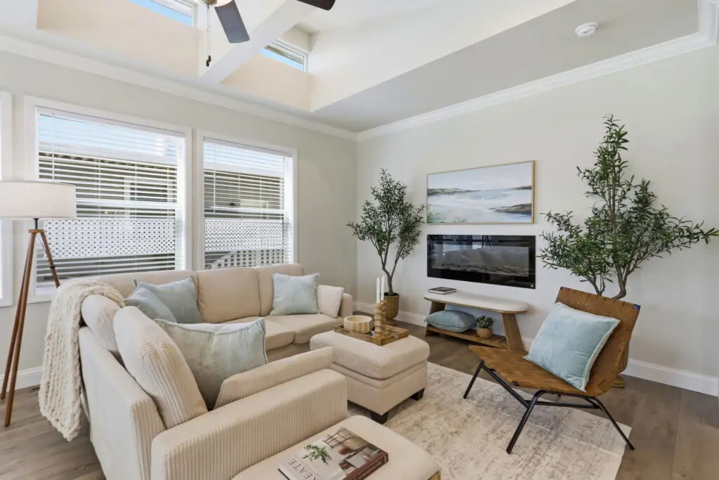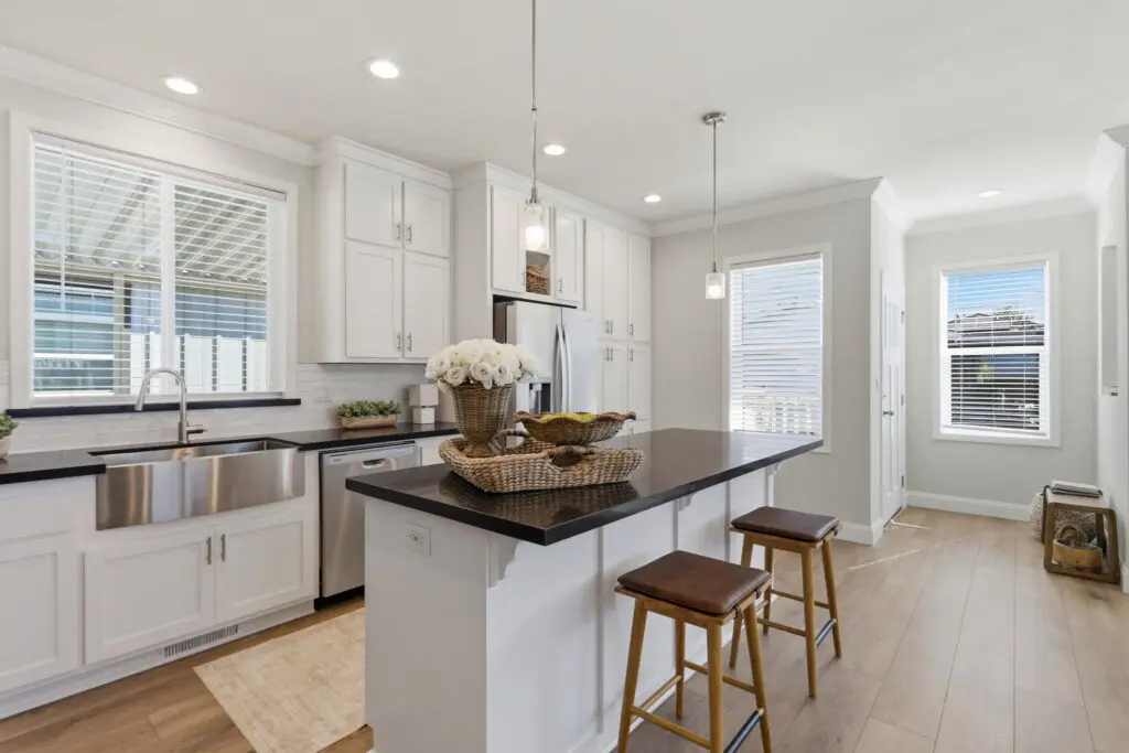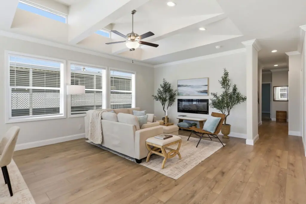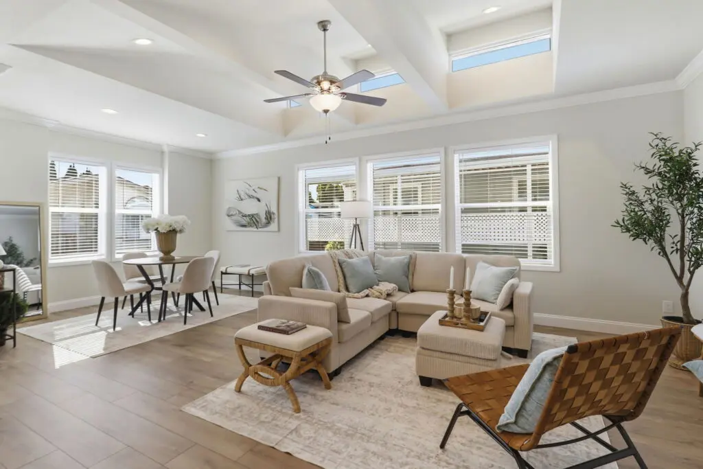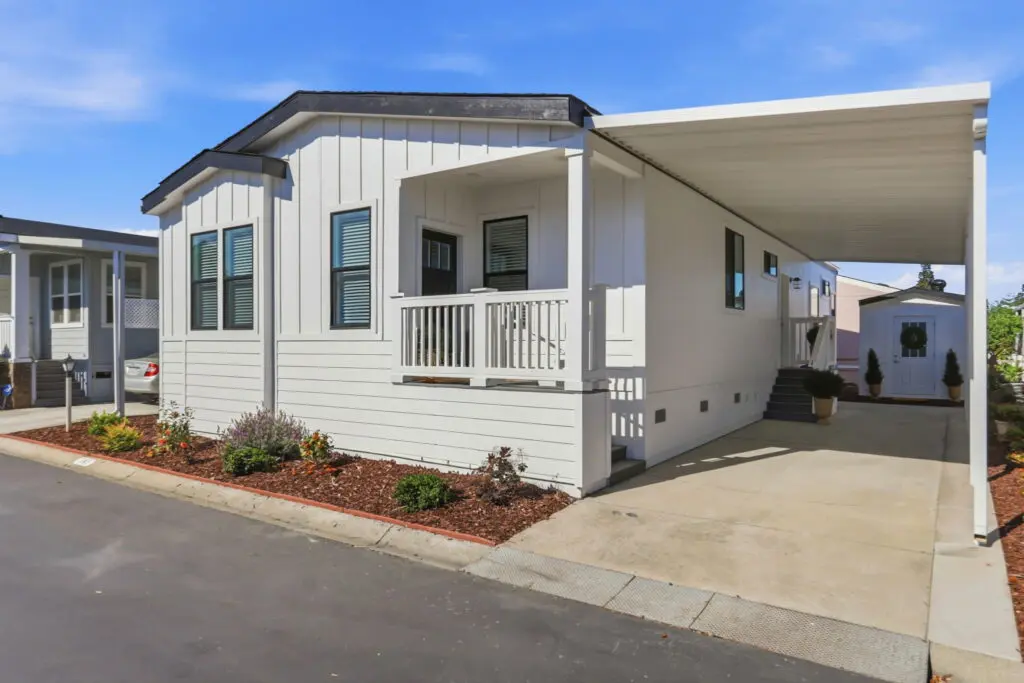 This stunning and brand new 3 bedroom, 2 bathroom home is situated in the welcoming 55+ Sunset Estates community. As you enter, you'll find a bright, spacious living area adorned with tasteful finishes and an abundance of natural light. The open concept kitchen boasts stainless steel appliances, sleek black quartz countertops, and contemporary white cabinetry. The master bedroom features cozy carpeting, a ceiling fan, a walk-in closet, and an en-suite bathroom equipped with dual sinks, a freestanding tub, and a separate shower. The two additional bedrooms are generously sized and offer ample closet space. Located right off Central Expressway 10 minutes from downtown Mountain View and Bayshore Sunnyvale Golf Course, the vibrant location provides an array of entertainment including coffee shops and restaurants. Call (866) 494-8993 today for more information!