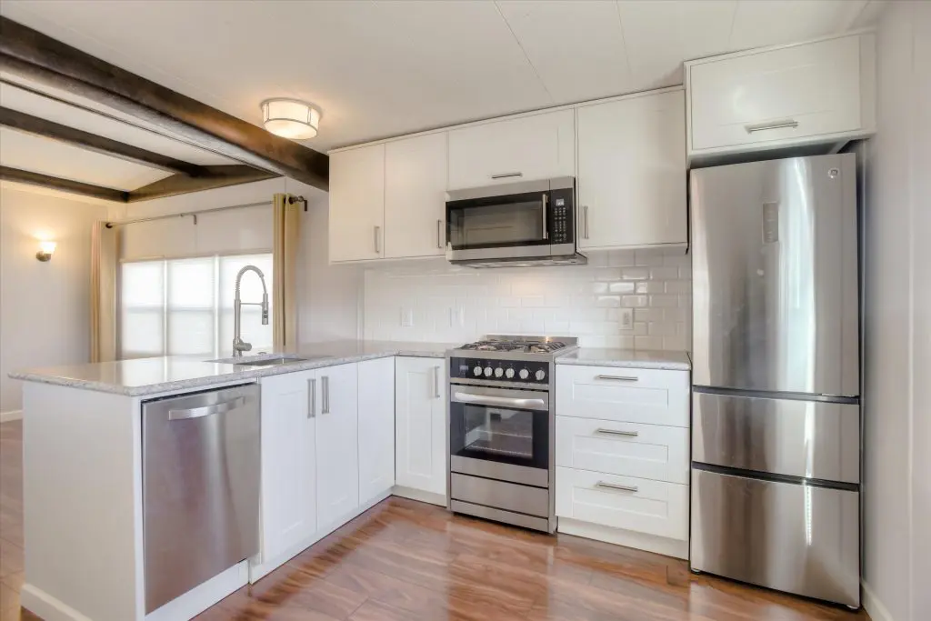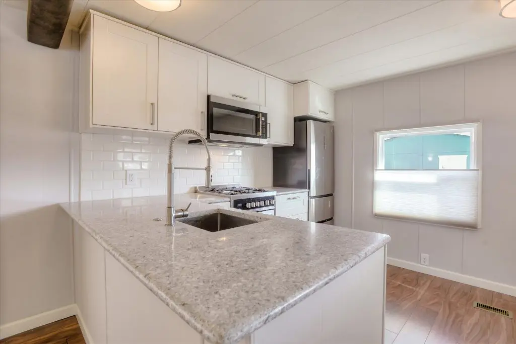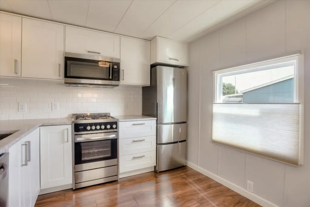 No detail overlooked. New furnace, water heater, wood laminate flooring, all cabinetry, appliances, kitchen and bathroom remodel, washer/dryer combo, skylight, water heater, plumbing, dual pane windows and doors, insulation and skirting, light fixtures, and drought-tolerant landscaping. Two Redwood staircases with under-storage, and the original storage shed which can be doubled in size if replaced. Six seismic stabilization piers have been added to protect your new home.