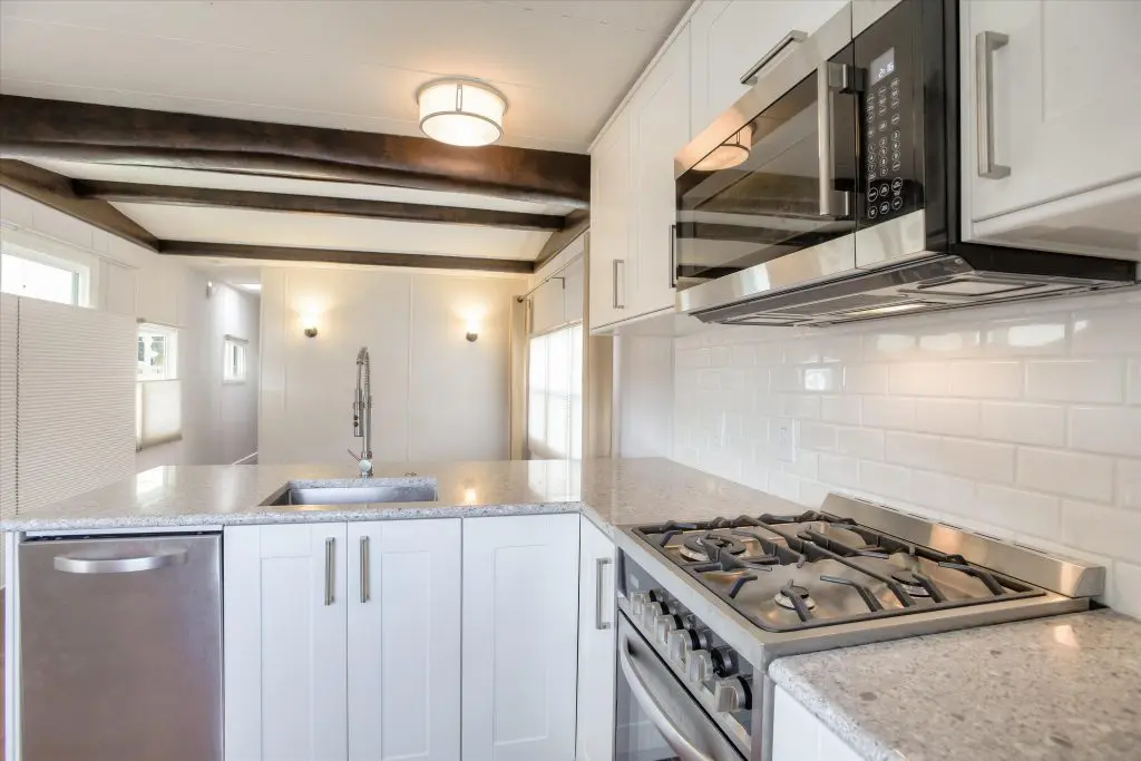 Designer interior finishes include under-mount sinks, quartz countertops (stronger than granite), tasteful LED fixtures, and sleek appliances. Gas kitchen with dishwasher, garbage disposal, microwave, and bottom-freezer-refrigerator for easy use. Shower-over-tub with plenty of cabinets. Top-down/bottom-up blinds for privacy throughout.