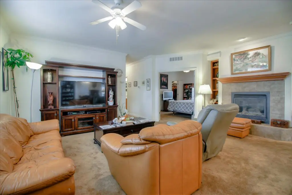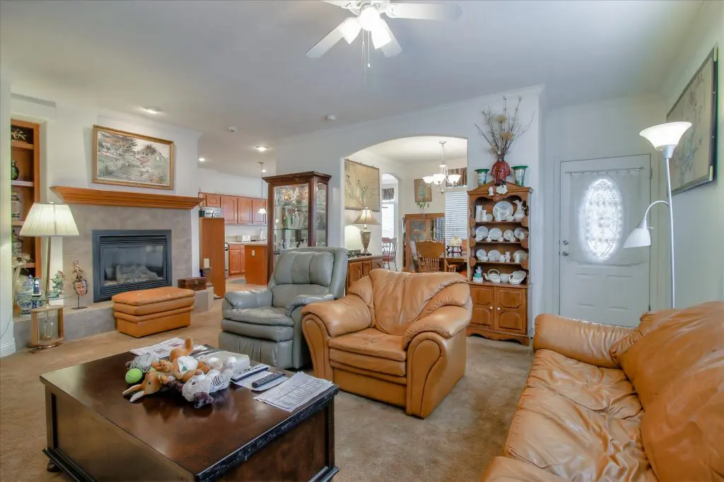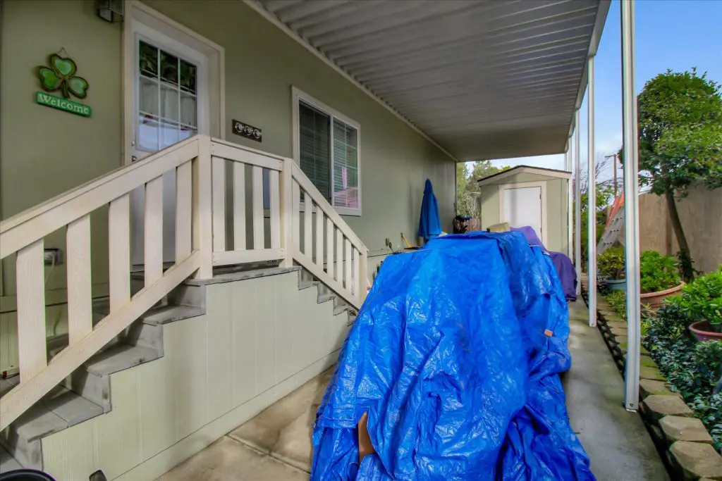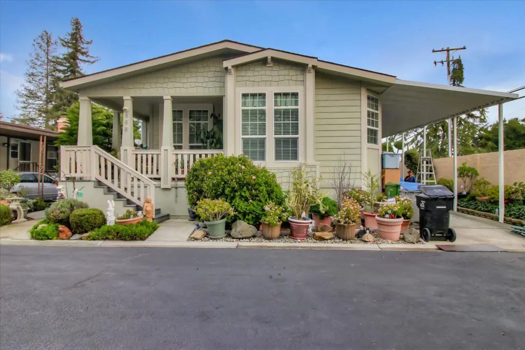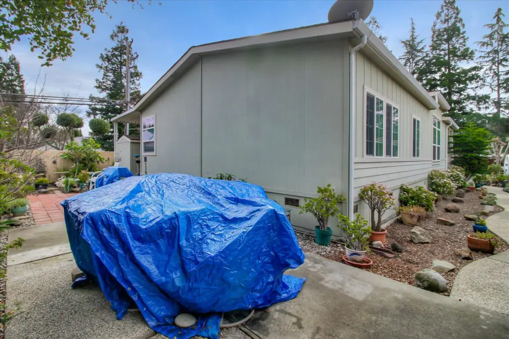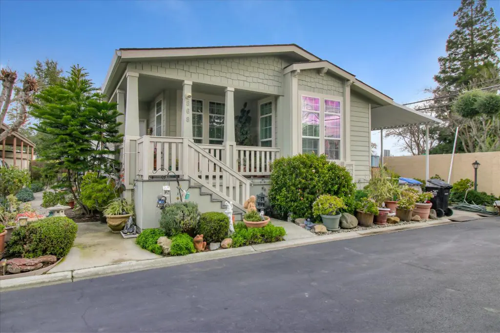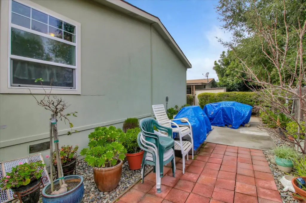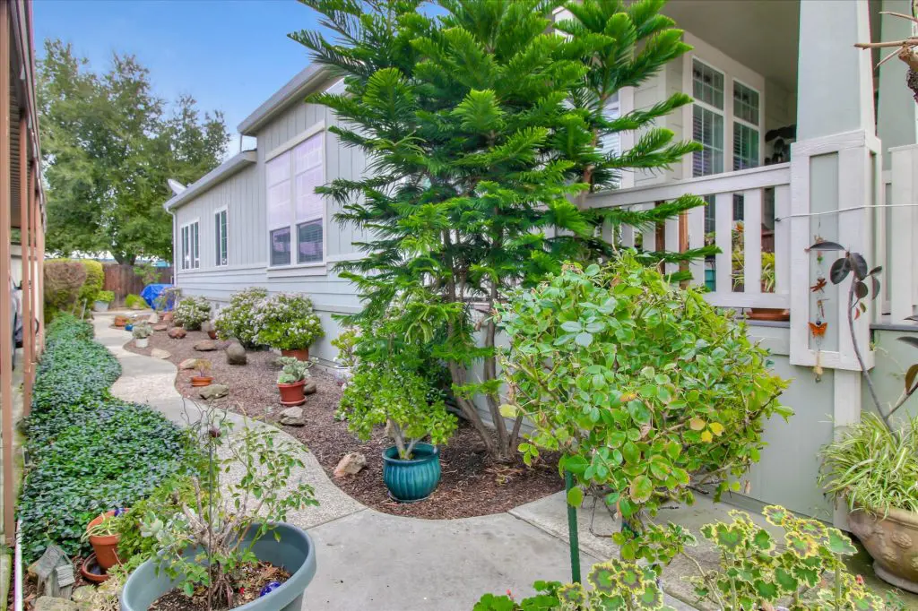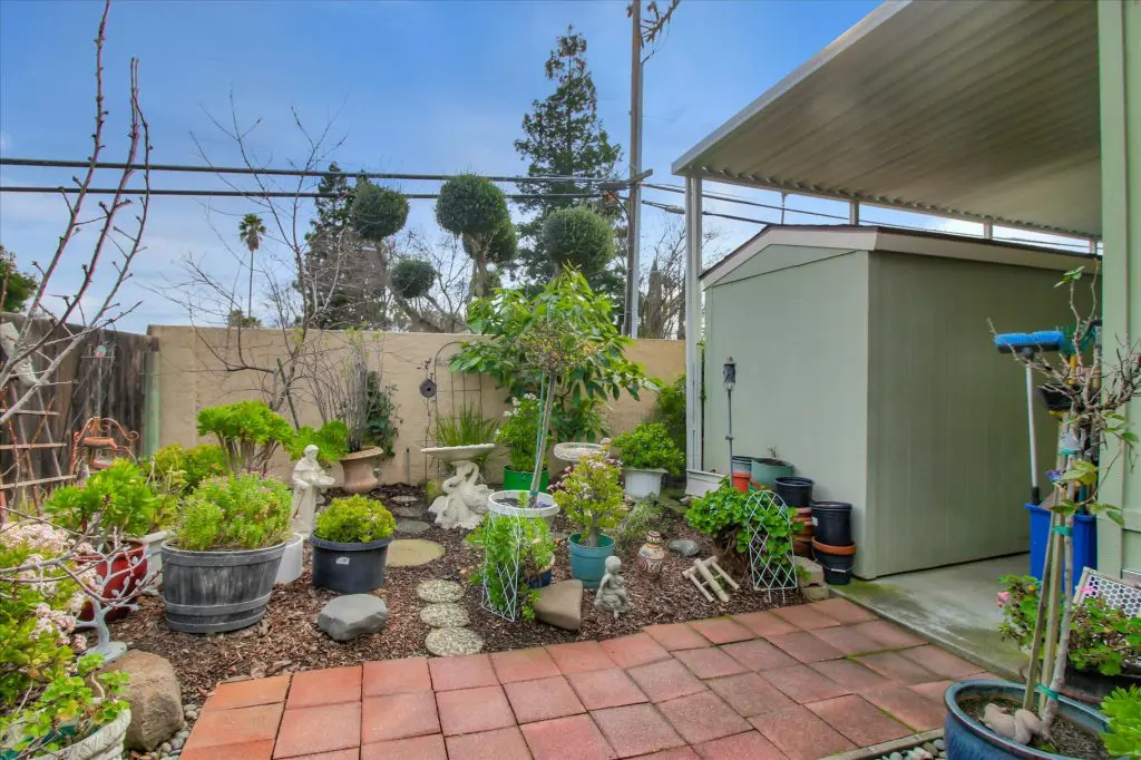 Senior park living at its best! You're gonna LOVE where you live in this spacious, well-adorned home in Villa Teresa. Located in a quiet cul-de-sac with guest parking nearby, this home features a beautiful landscaped yard with luscious potted plants, fruit trees, hard-scaping, and a great space for outdoor entertaining. Trex decking on the front porch and side steps and a sprinkler system if desired to use for watering. Gourmet kitchen features an island, nook, and tons of cabinet and counter space. Master suite will thrill you with walk-in closet, dual vanities, soaking tub, and large shower equipped with grab bars and tile floors. Double doors open up to one of the large guest bedrooms off the cozy living room. Ceiling fans, 2" blinds, fireplace, and a separate dining room are additional features that you will love! Don't miss the matching shed, water softener, and ample parking for your cars. You must see this home to believe it! Call (866) 494-8993 for a private viewing of this home in a 5 star senior community before it is sold!