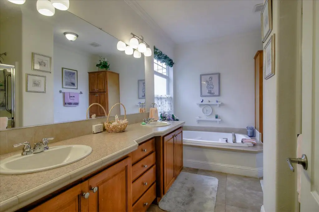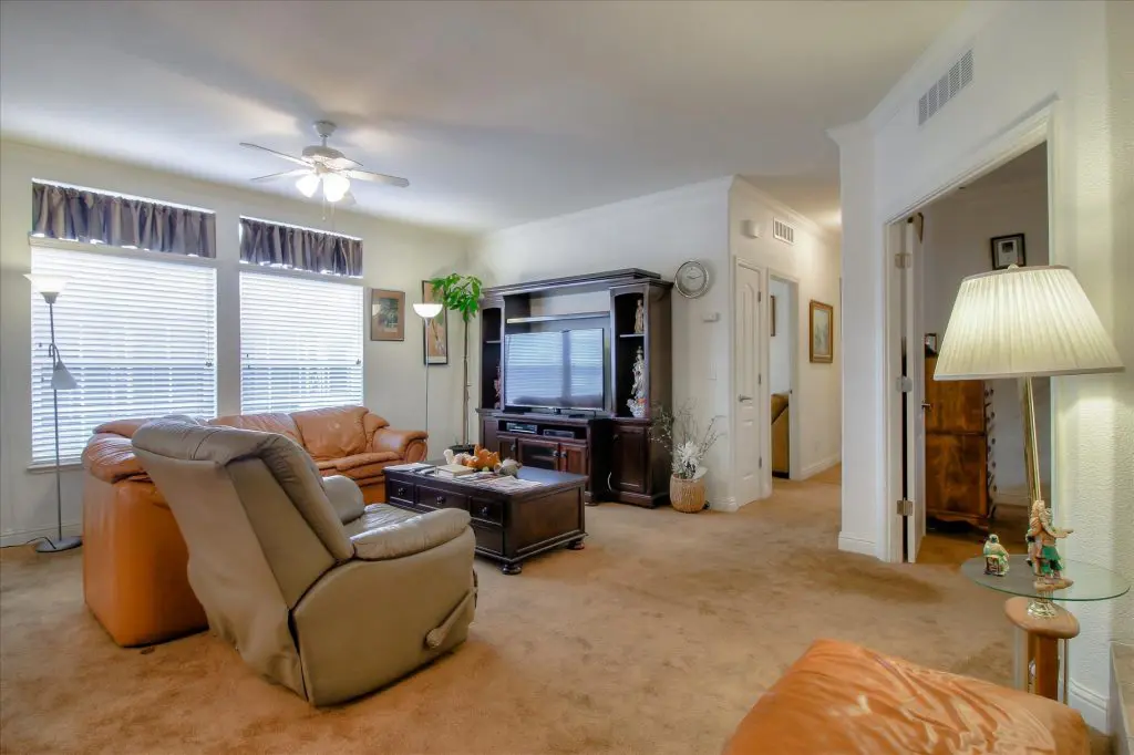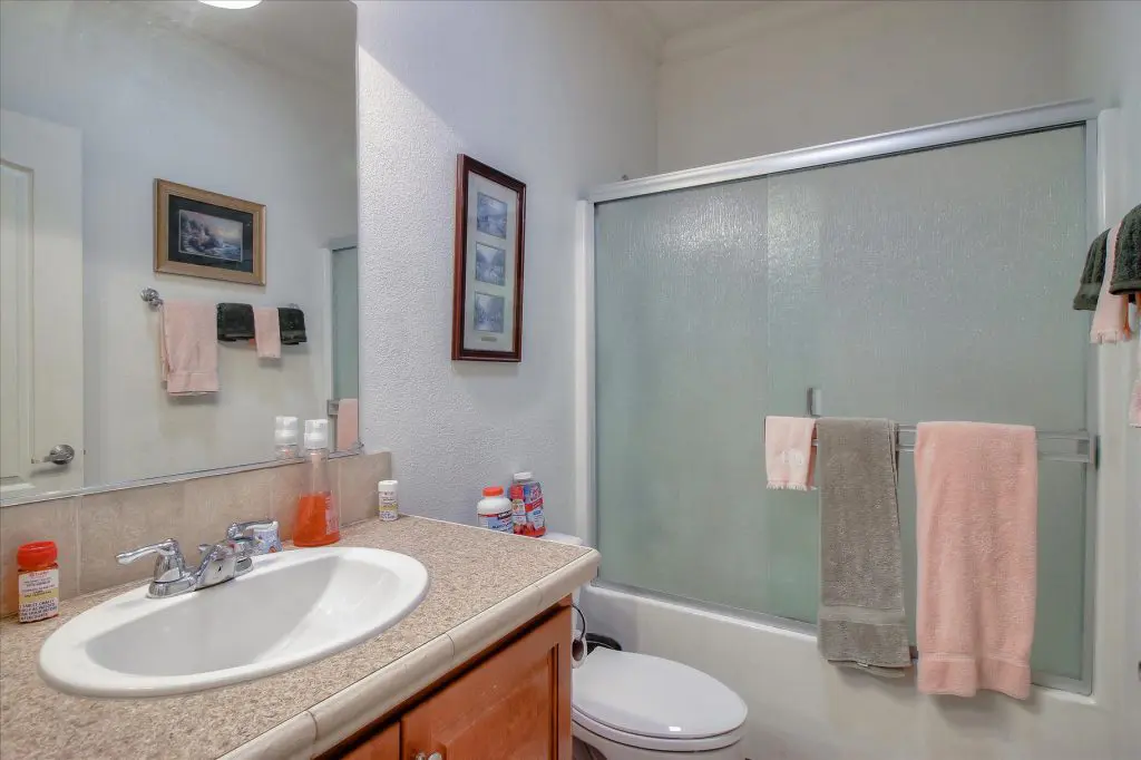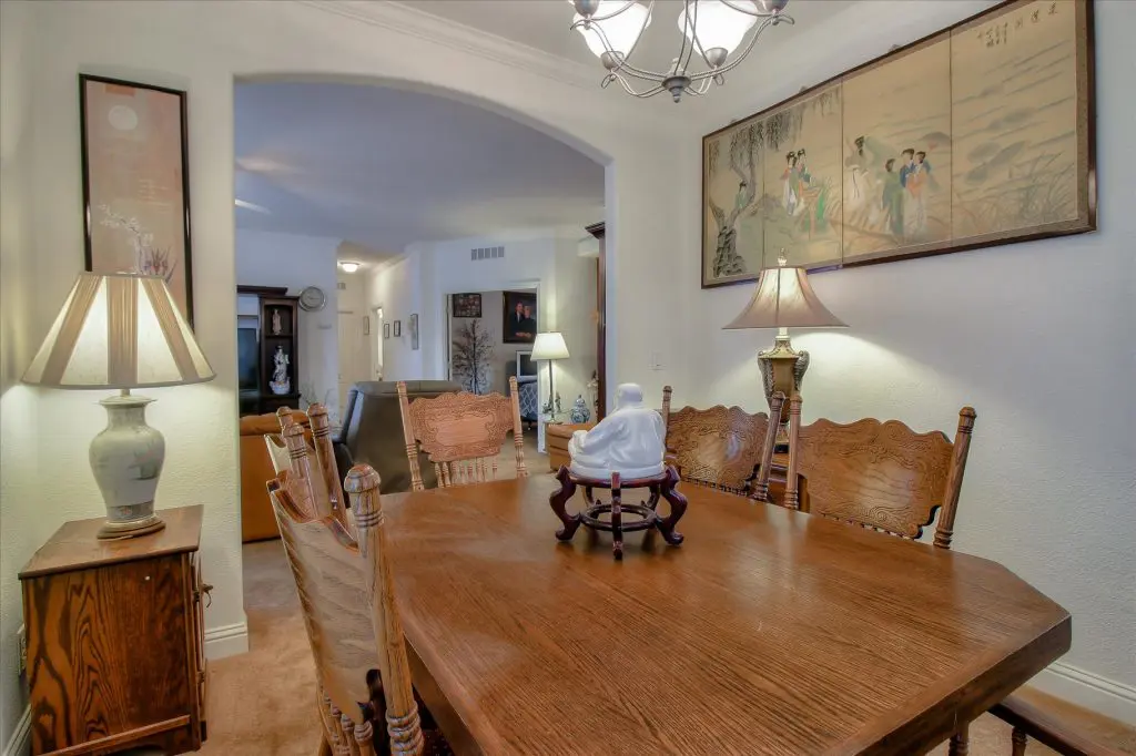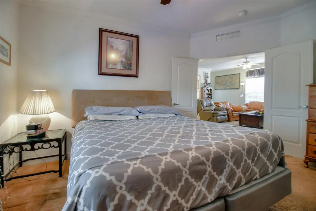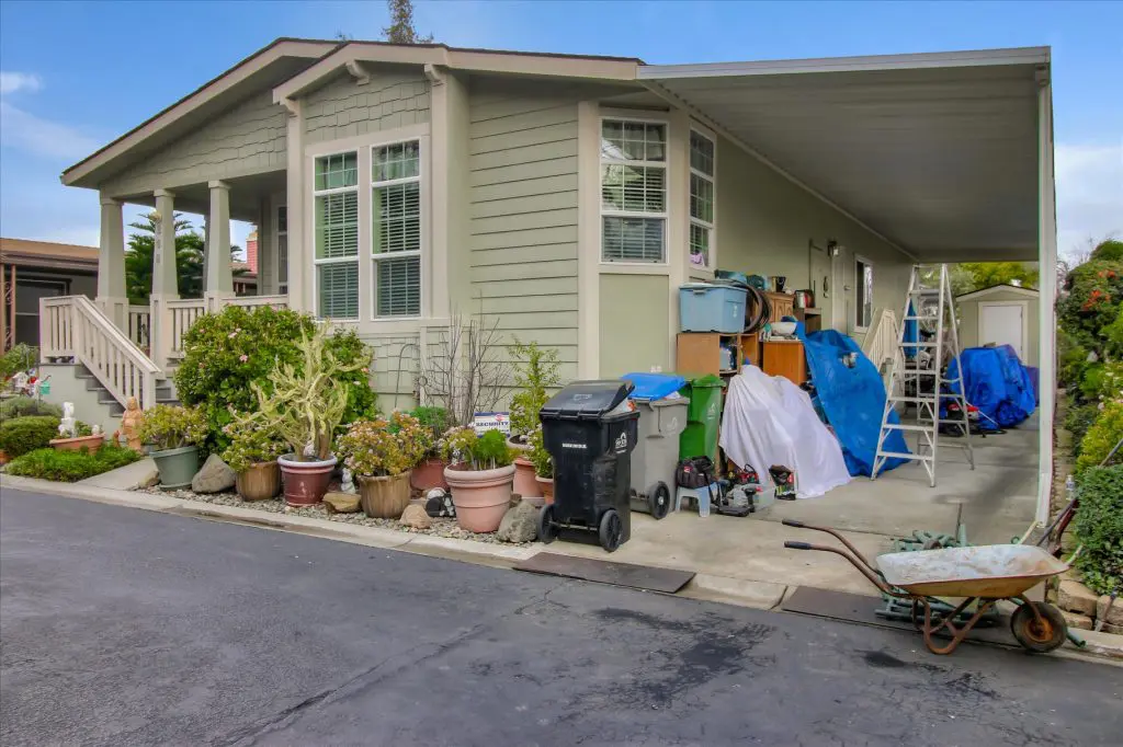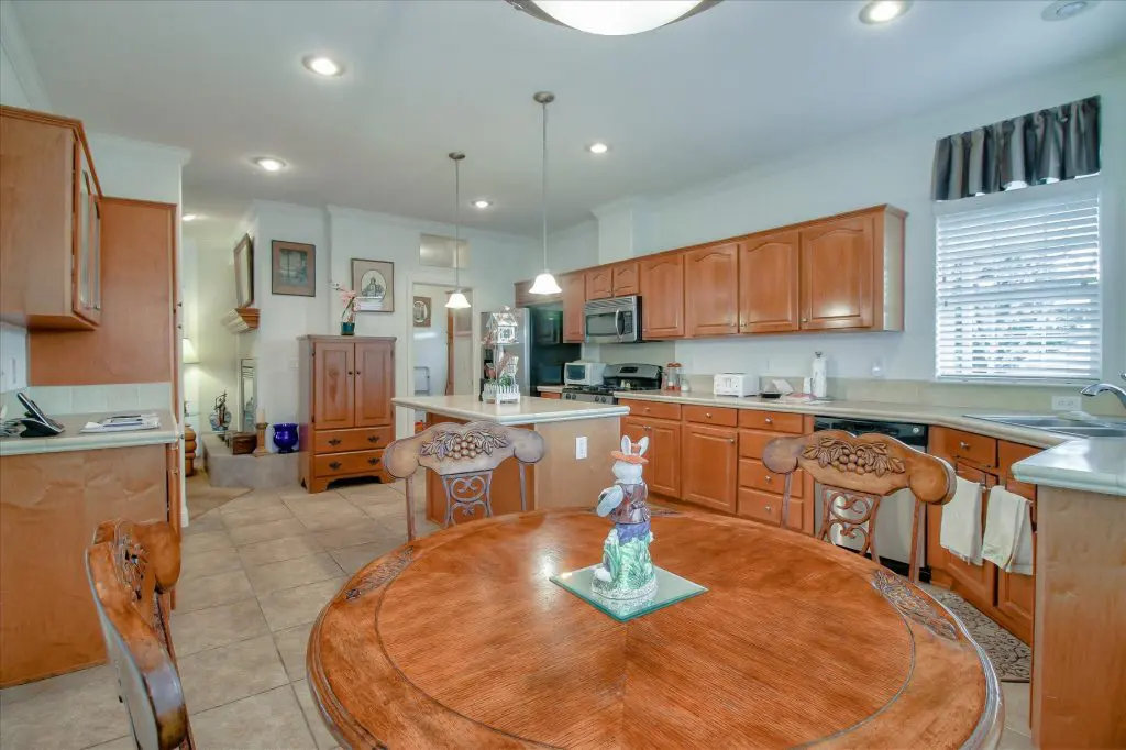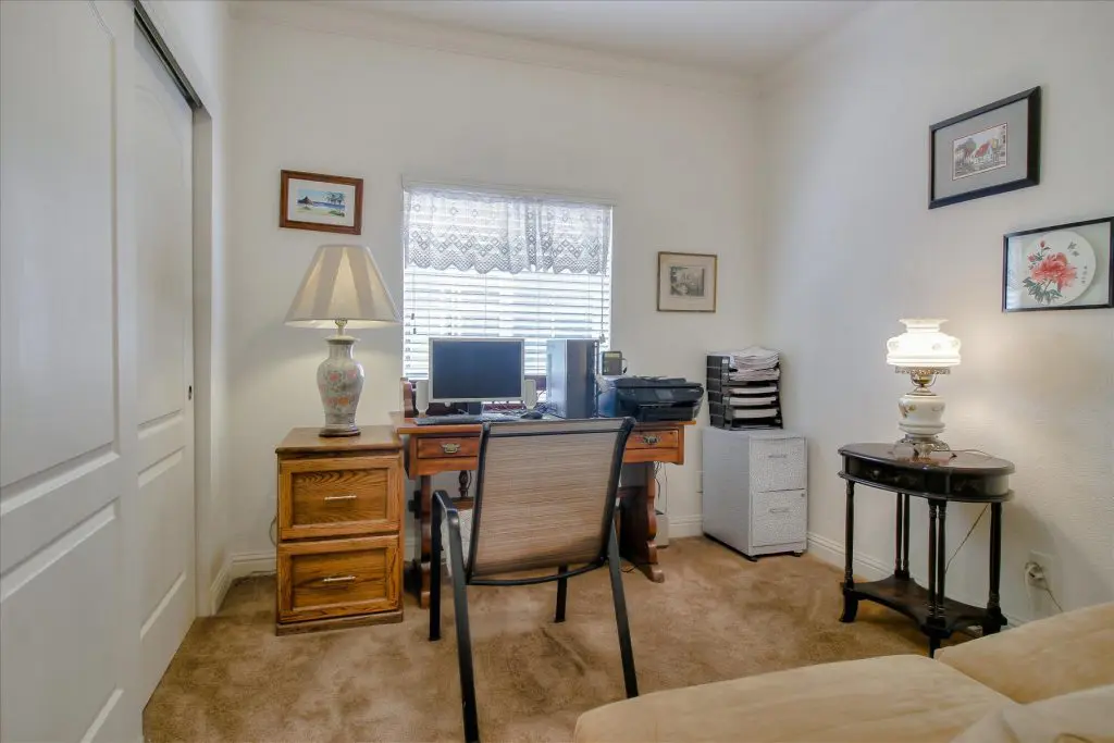 Senior park living at its best! You're gonna LOVE where you live in this spacious, well-adorned home in Villa Teresa. Located in a quiet cul-de-sac with guest parking nearby, this home features a beautiful landscaped yard with luscious potted plants, fruit trees, hard-scaping, and a great space for outdoor entertaining. Trex decking on the front porch and side steps and a sprinkler system if desired to use for watering. Gourmet kitchen features an island, nook, and tons of cabinet and counter space. Master suite will thrill you with walk-in closet, dual vanities, soaking tub, and large shower equipped with grab bars and tile floors. Double doors open up to one of the large guest bedrooms off the cozy living room. Ceiling fans, 2" blinds, fireplace, and a separate dining room are additional features that you will love! Don't miss the matching shed, water softener, and ample parking for your cars. You must see this home to believe it! Call (866) 494-8993 for a private viewing of this home in a 5 star senior community before it is sold!